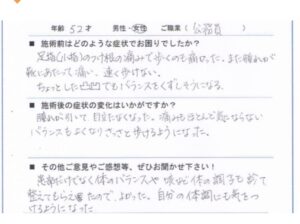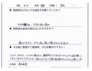 先生から体の重心を元に戻すなどの色々な施術をしていただきました。 前は仕事中すごく痛く、右足をかばっていたのですが、今では仕事中も普段も痛みを感じないですし、楽に歩けます!! こちらに来てよかったと思います。ありがとうございました!!