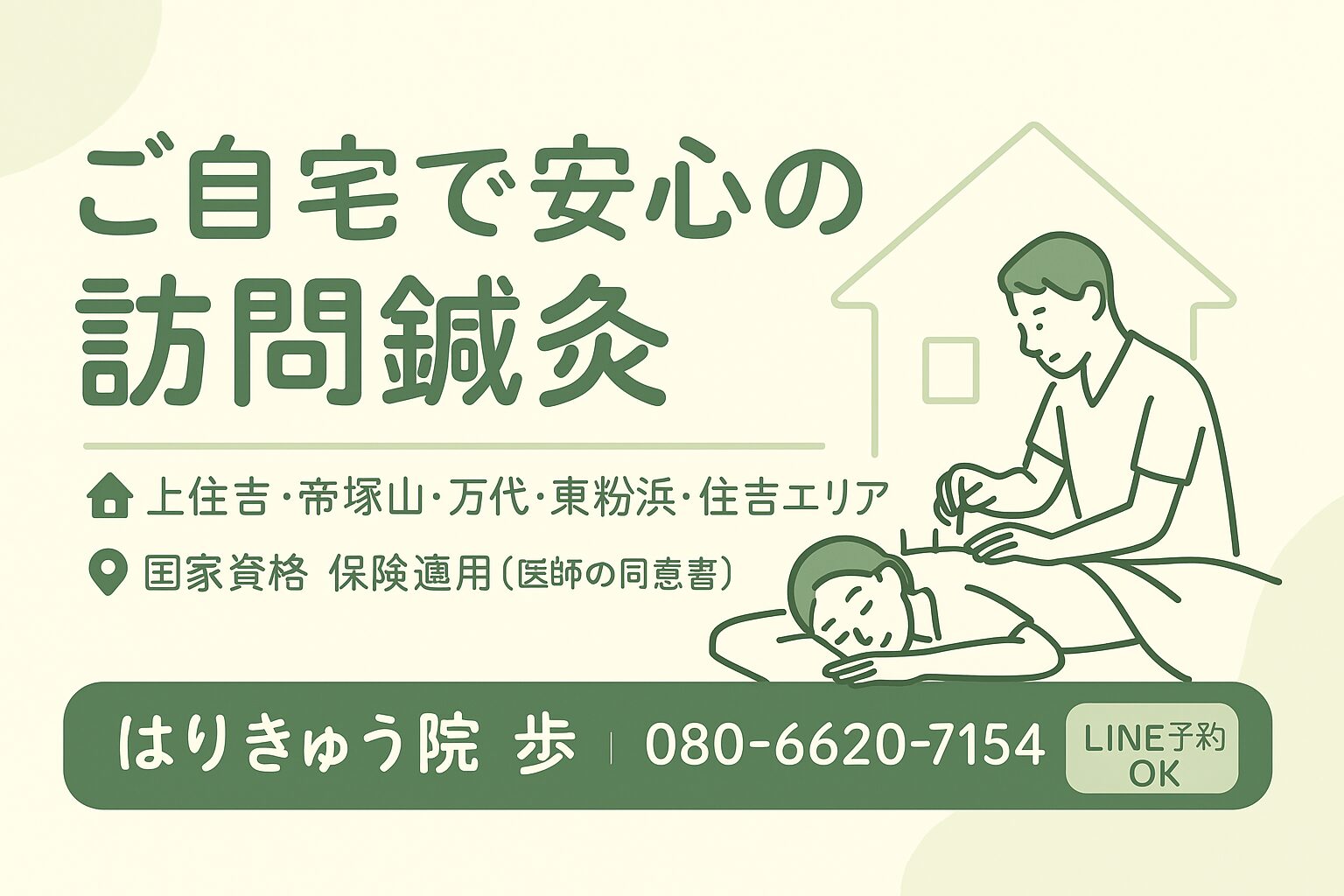 上住吉・帝塚山・万代・東粉浜・住吉エリアを中心に、地域密着で訪問鍼灸を行っています。